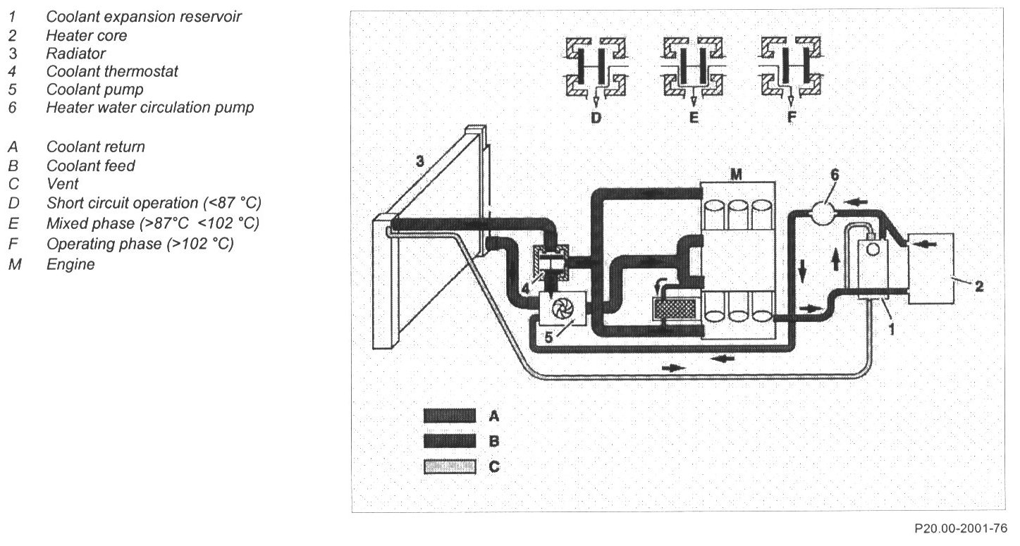 The major portion of the coolant does not flow through the heater core (2), but rather from the engine to the coolant thermostat (4). The water is routed through the radiator (3) or directly to the coolant pump (5) depending on the water temperature.