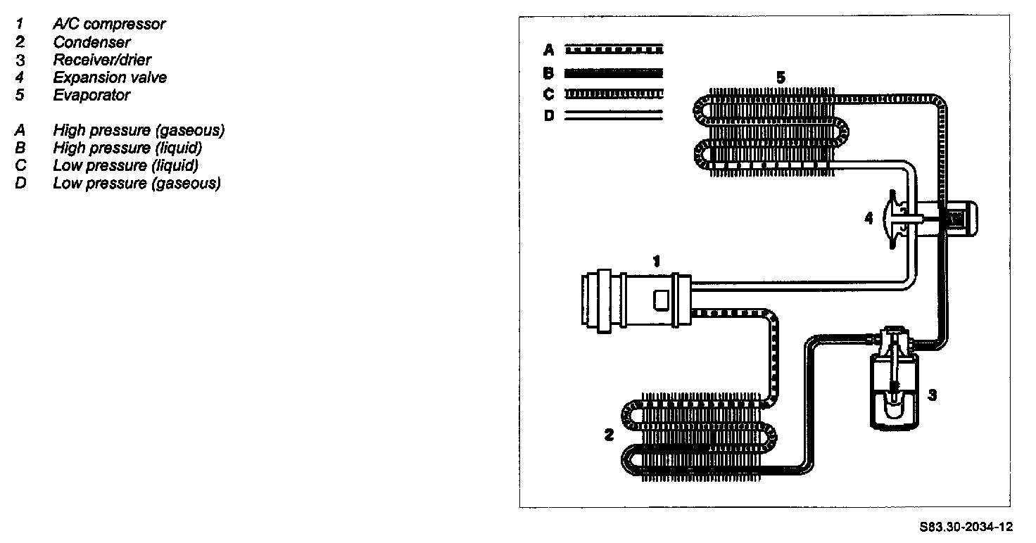The moisture contained in the air is condensed out and drained into the atmosphere. The air is dried. The A/C compressor (1) sucks the refrigerant which has become gaseous due to the heat it has absorbed and compresses it again.
