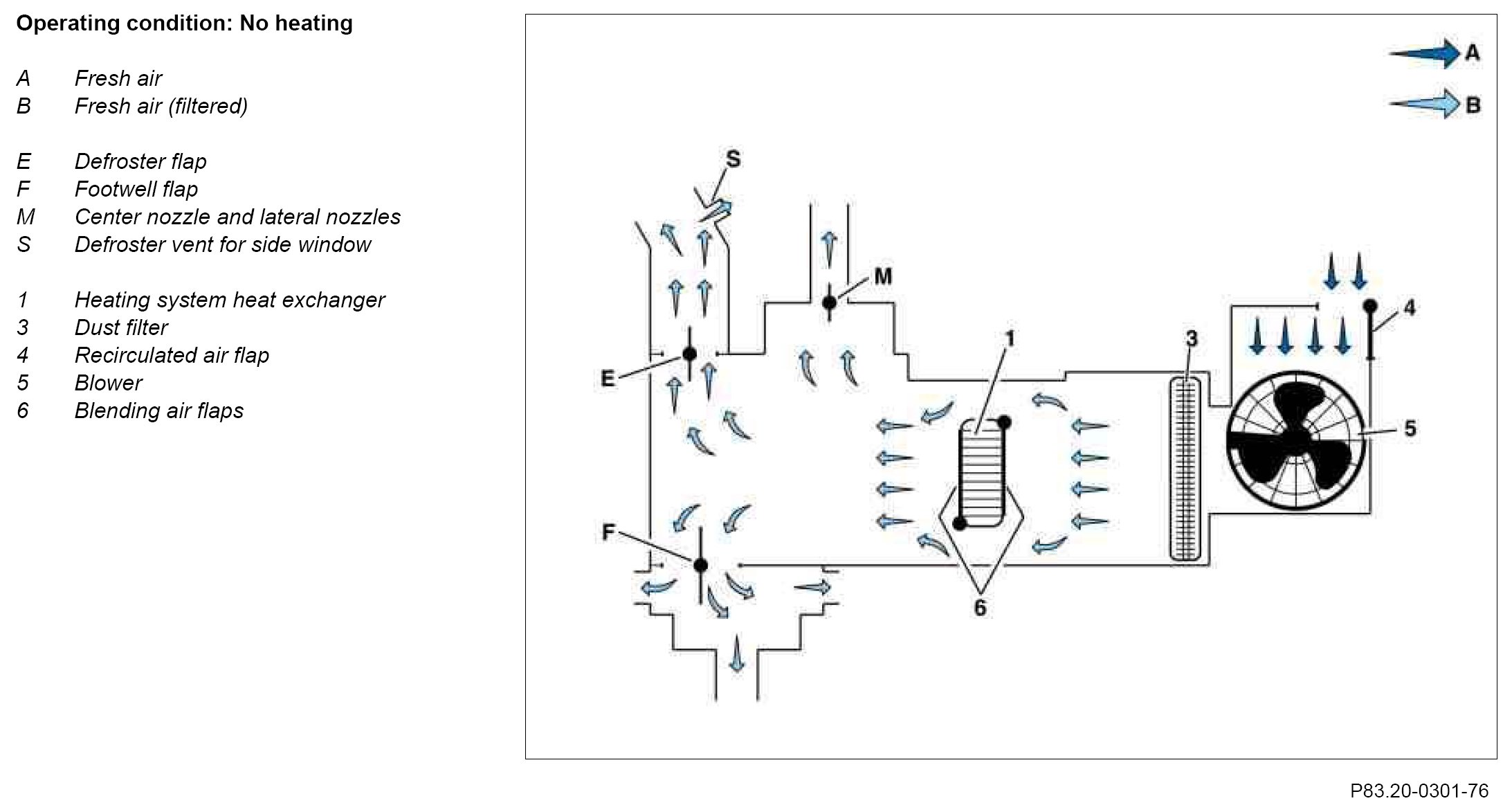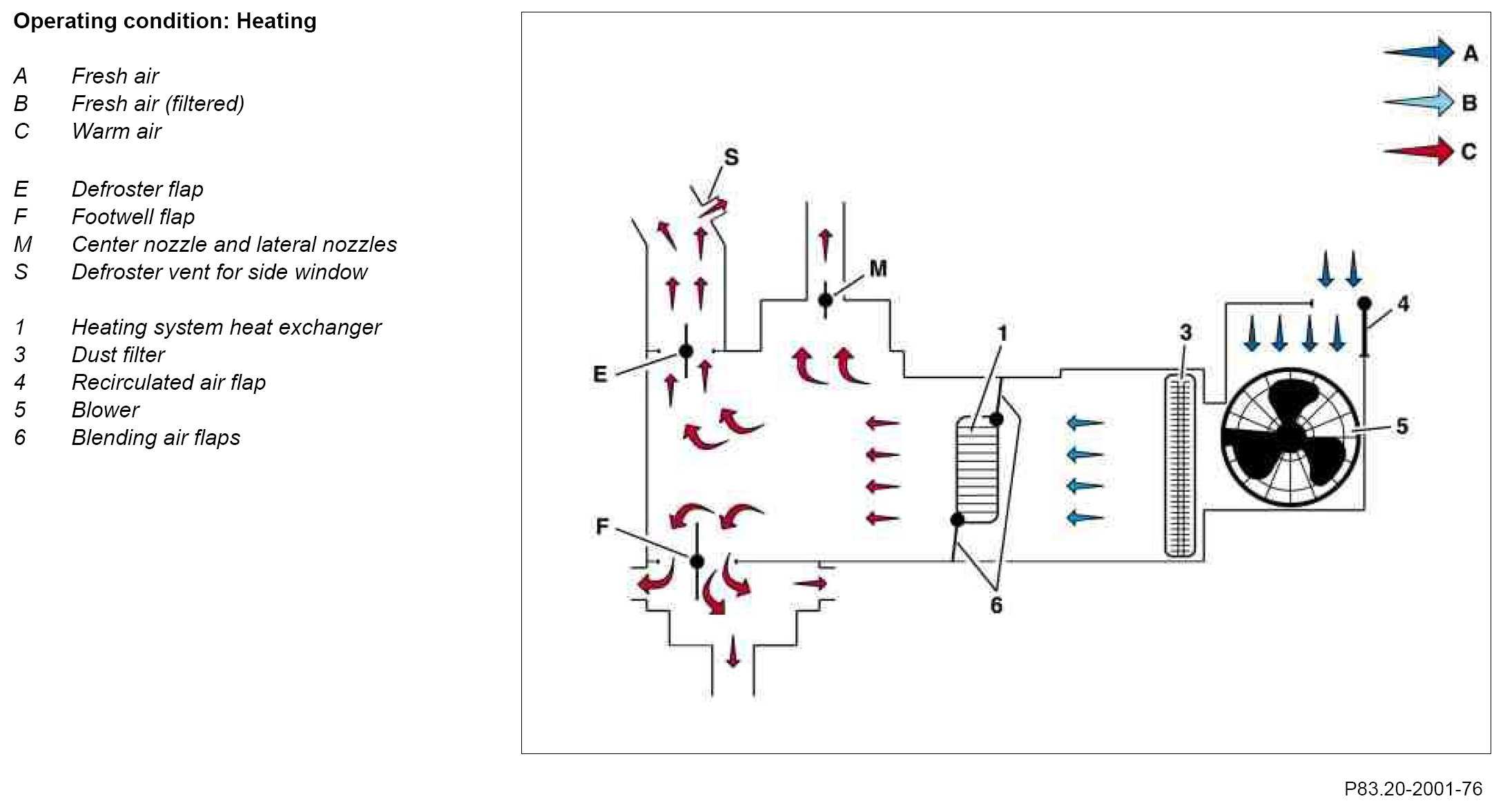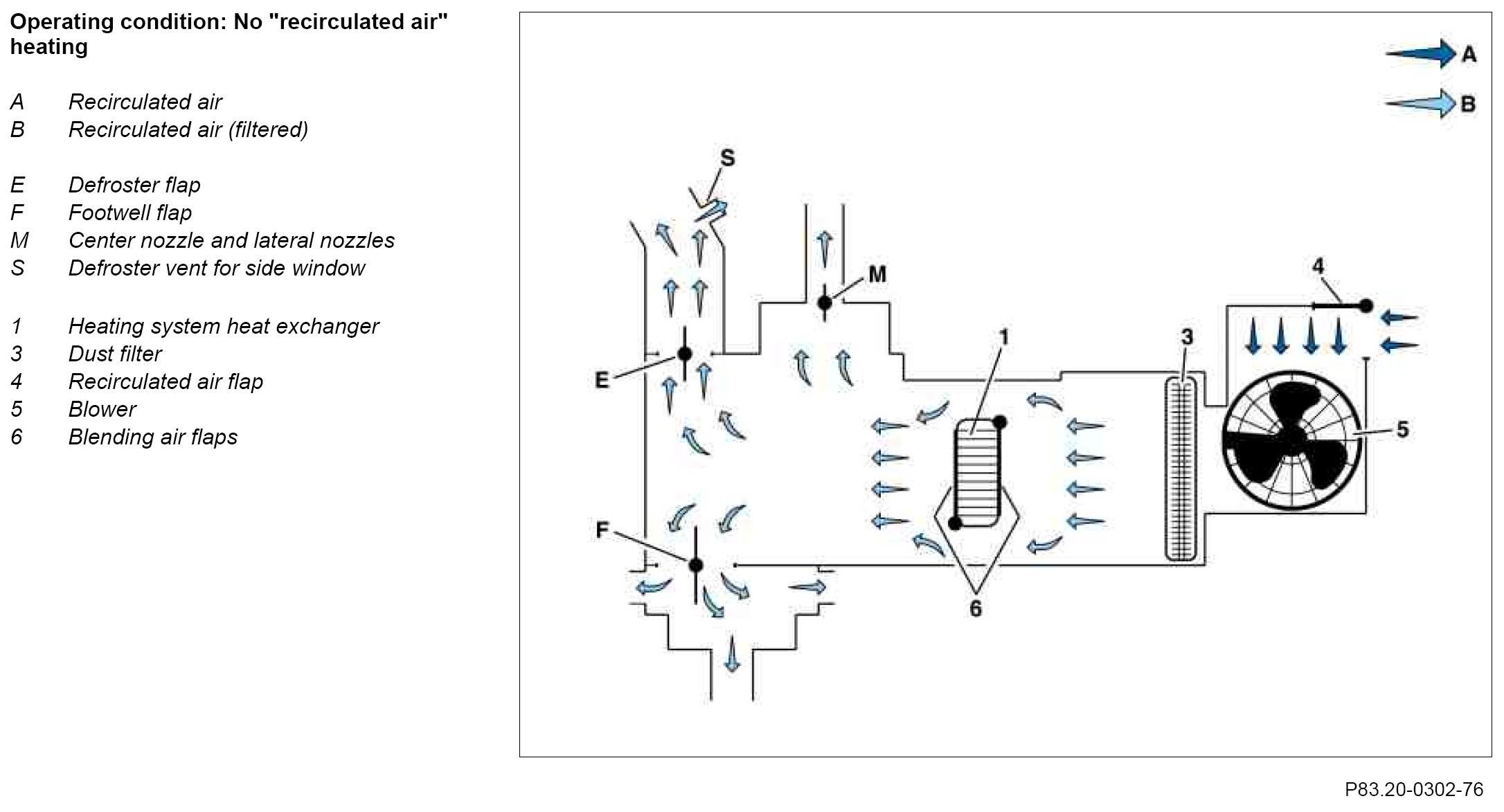 The cleaned fresh air (B) is heated up by the heat exchanger (1). The warm air (C) is conducted via the air outlets (E, F, M and S) into the vehicle interior. The recirculated air flap (4) is closed.