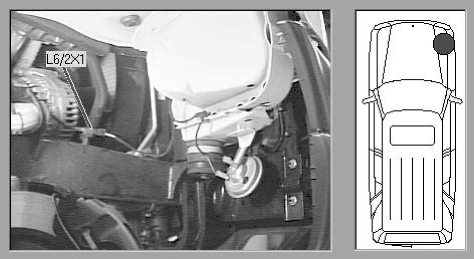 Beneath vehicle, in front of right front wheel well.