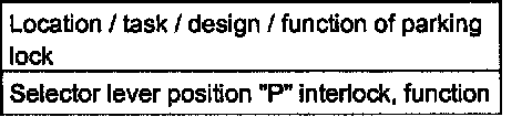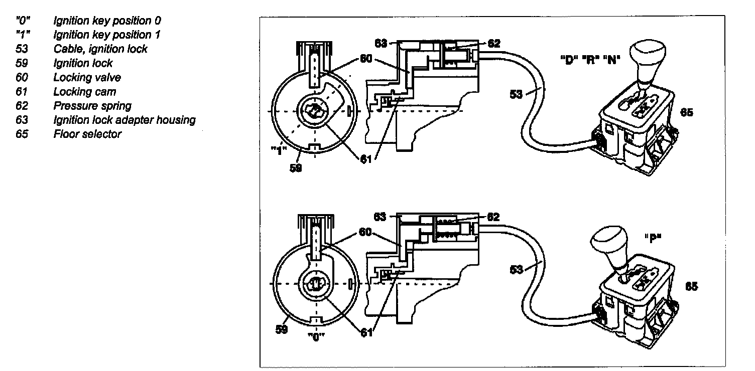 The ignition lock interlock connects the selector lever of the floor selector to the ignition lock. It prevents the driver removing the ignition key if selector lever position "P" is not engaged. When the parking lock is not engaged (selector lever position "D", "R", "N"), the locking valve (60) locks the locking cam (61). The pressure spring (62) only pulls the locking valve (60) away from the locking cam (61) in selector lever position "P". The ignition key can now be turned to the "0" position and removed from the ignition.