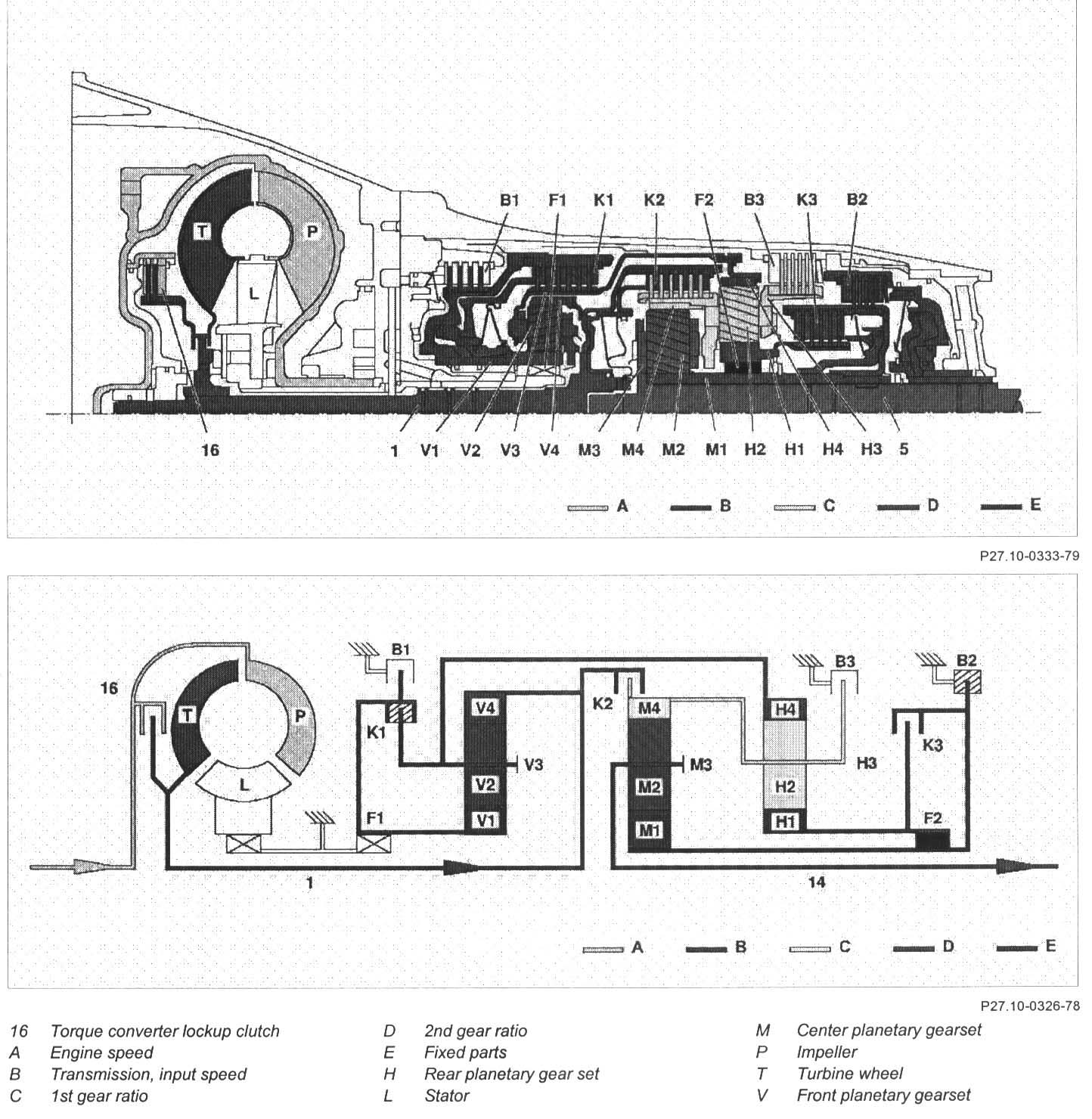 Torque from the torque converter is increased via the propeller shaft (1) and the center and rear planetary gearset and transferred to the output shaft (5).