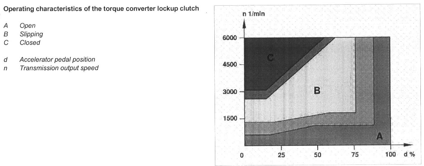 The aim of using the torque converter lockup dutch is to reduce the fuel consumption and exhaust gas emissions of the vehicle by reducing torque converter slip. This stands in contradiction to the ride comfort demands made on the drive train with regard to its vibration behavior. The task of the electronic transmission control is therefore to dose the clutch in all driving situations relevant to fuel consumption, if possible, and ensure that the engine vibrations are isolated from the drive train. The characteristic curves shown in the diagram illustrate the different operating states of the torque converter lockup dutch in relation to the accelerator pedal position and the transmission output speed, plotted for one transmission gear.