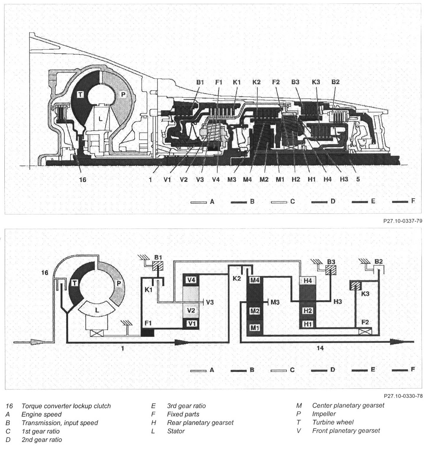 The ring gear (V4) is driven by the propeller shaft (1). The sun gear (V1) is held against the housing by the locked freewheel F1 during acceleration and via the engaged multiple-disc brake B1 during deceleration. The planet gears (V2) turn on the fixed sun gear (V1) and increase the torque from the ring gear (V4) to the planet carrier (V3). The planet carrier (V3) moves at a reduced speed in the running direction of the engine.