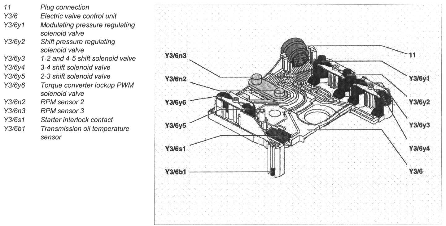The electric valve control unit (Y3/6) consists of a plastic shell which houses the RPM sensors (Y3/6n2, Y3/6n3), regulating solenoid valves (Y3/6y1, Y3/6y2), solenoid valves (Y3/6y3, Y3/6y4, Y3/6y5), the PWM solenoid valve (Y3/6y6), the starter interlock contact (Y3/6s1) and the transmission oil temperature sensor (Y3/6b1). Conductor tracks integrated into the shell connect the electric components to a plug connection (11).