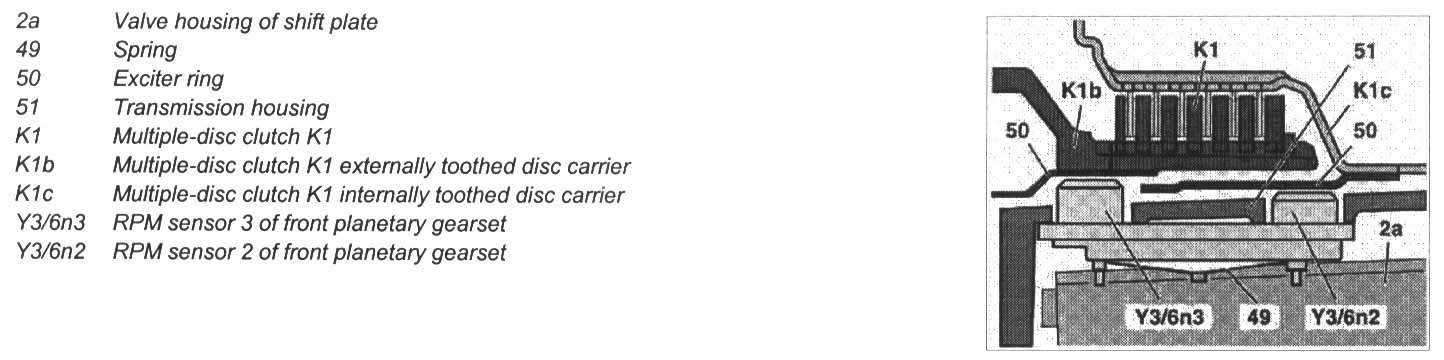 RPM sensor 2 (Y3/6yn2) records the speed of the front sun gear via the externally toothed disc carrier of the multiple-disc clutch K1 (K1b) and RPM sensor 3 (Y3/6yn3) records the speed of the front planet carrier via the Internally toothed disc carrier of multiple-disc clutch K1 (K1c).