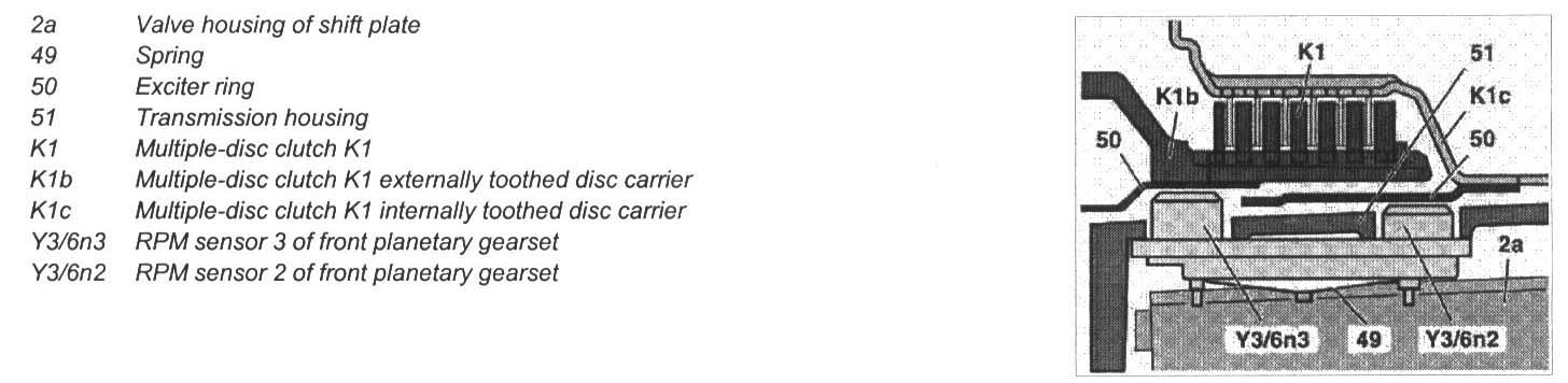 RPM sensor 2 (Y3/6yn2) records the speed of the front sun gear via the externally toothed disc carrier of the multiple-disc clutch K1 (K1b) and RPM sensor 3 (Y3/6yn3) records the speed of the front planet carrier via the internally toothed disc carrier of multiple-disc clutch K1 (K1c).