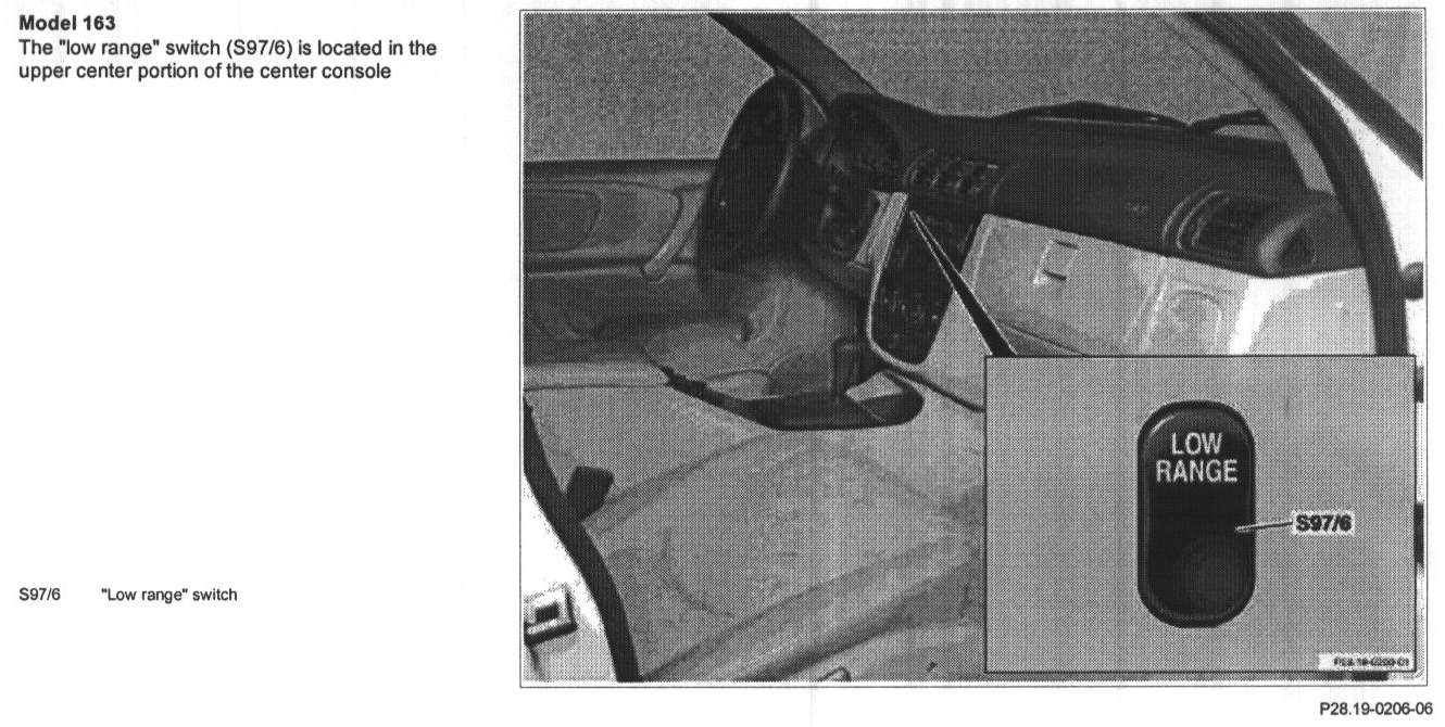 The "low range" switch (S97/6) is located in the upper center portion of the center console