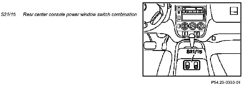 The rear center console power window switch combination (S21/15) is located in the rear center console behind the armrest with stowage compartment.