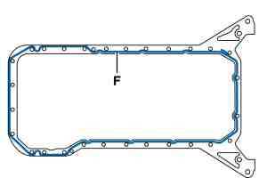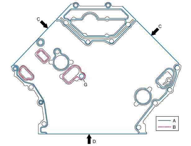 Timing case cover, oil pan top section, oil pan bottom section and end cover are sealed with a silicone sealant at the points A, C, D, E, F and G.