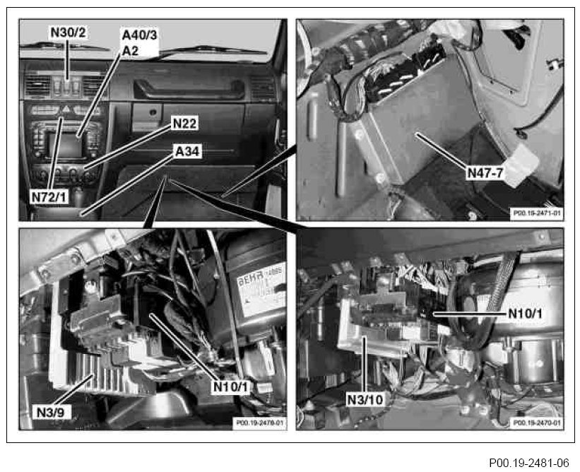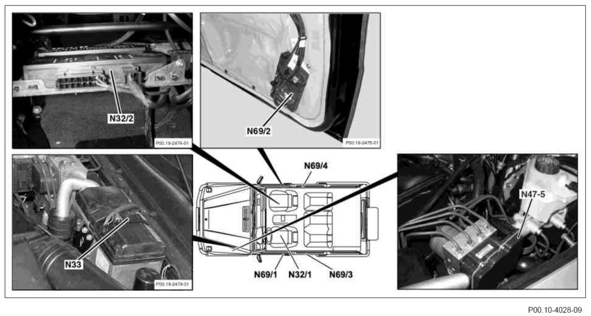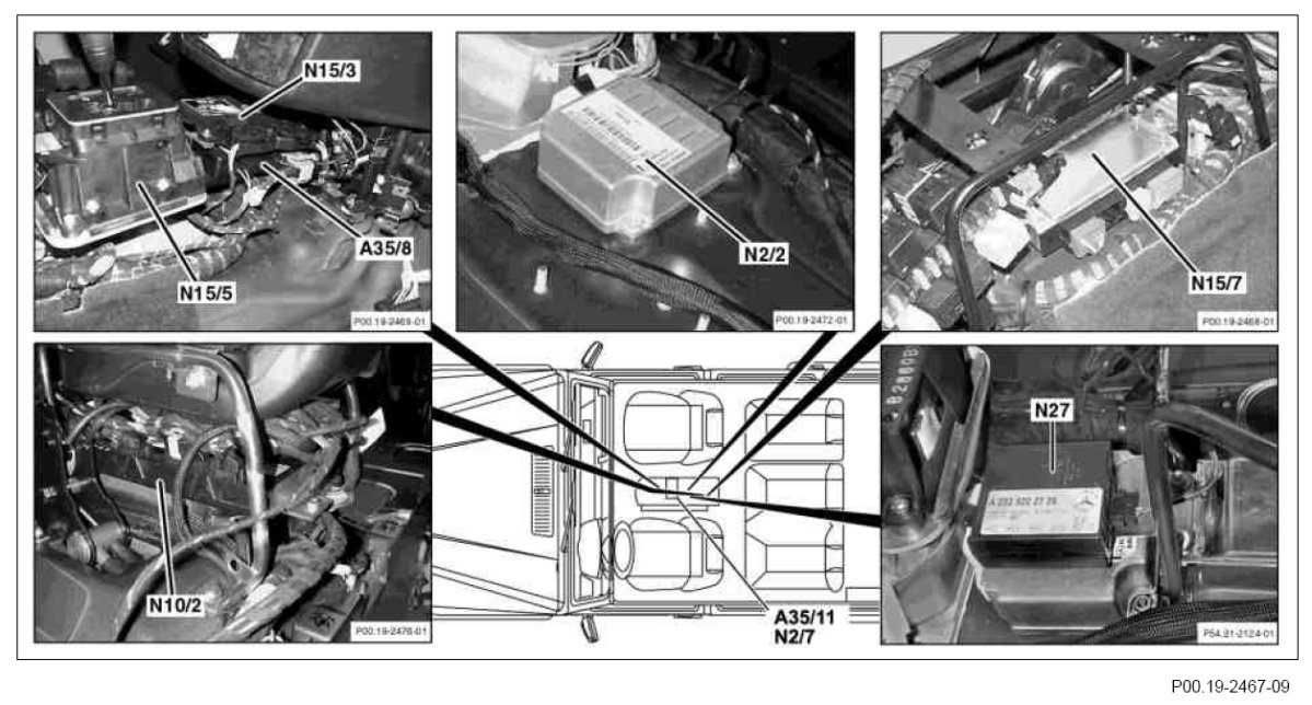 Control units in the area of the doors and seats as well as engine compartment
