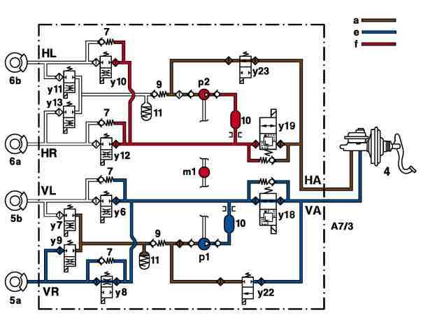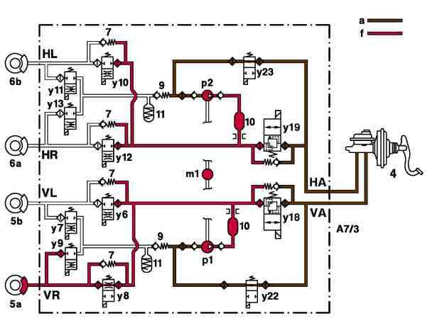 --> Actuated and switches to the flow position, the pressure reduction in the right front wheel brake (5a) is therefore initiated when the right front solenoid valve, hold pressure (A7/3y8) is closed.