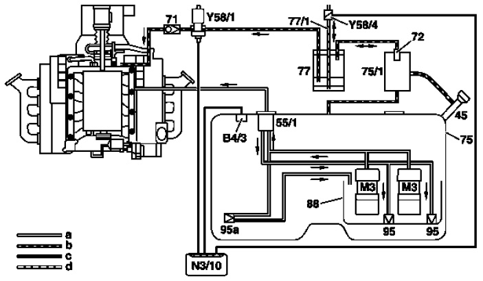 The activated charcoal canister shut-off valve (Y58/4) is closed and the purge control valve (Y58/1) opened. The vacuum in the intake manifold reaches the fuel tank (75).