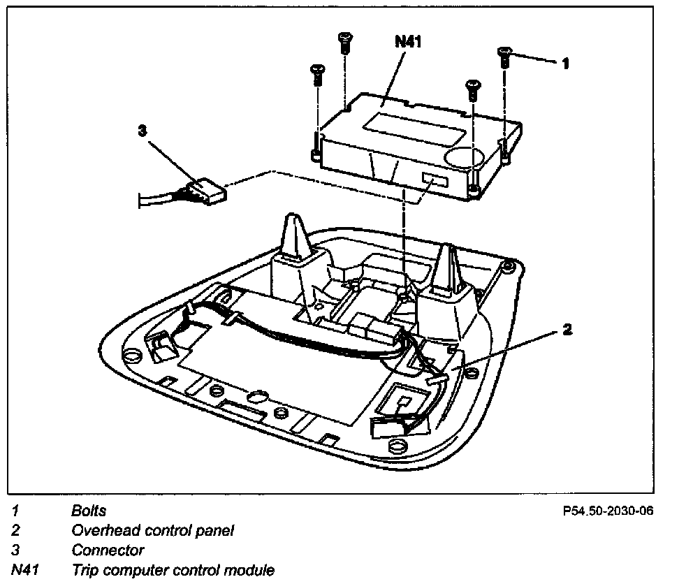 3 Unscrew trip computer control module (N41) from overhead control panel (2).