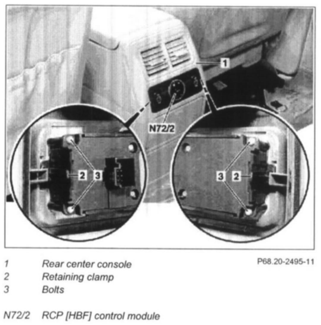 2 Remove RCP [HBF] control module (N72/2) from rear center console
