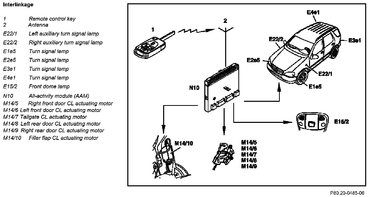 When the "Lock vehicle" button is pressed, the remote control key transmits a radio frequency signal. This signal contains the code for checking access authorization and the instruction to lock the vehicle. In the vehicle, the signal is received via the antenna by the receiver in the all-activity module (AAM) (N10). The AAM decodes the signal and checks the access authorization. If the code is valid, all doors which are closed are locked electrically by the AAM. Moreover, the central locking switch (S21s10) is disabled.