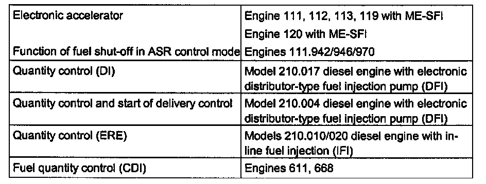 A drive moment control must take place in order to achieve optimum traction when the drive moment is too high (spinning wheels). The drive moment reduction is controlled by an exchange of data between the control module of the ASR (N47-1) or ESP, SPS and BAS control module (N47-5) traction system installed and the respective control module of the injection and ignition system via the CAN data bus. On the gasoline engine these are the control modules: EA (N4/1), LH-SFI (N3/1, N3/2, N3/3), HFM-SFI (N3/4) or ME-SFI (N3/10, N3/11, N3/12) and on the diesel engine the IFI control module (N3/7), DFI control module (N3/8) or CDI control module (N3/9).