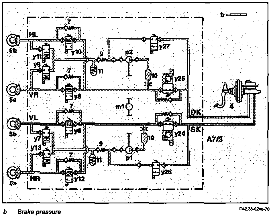 The brake pressure is first built up via the switchover solenoid valves (y24 and y25) and then in pressure circuit 1 (FL and RR) via the solenoid valves (y6 and y12) and in pressure circuit 2 (FR and RL) via the solenoid valves (y8 and y10).