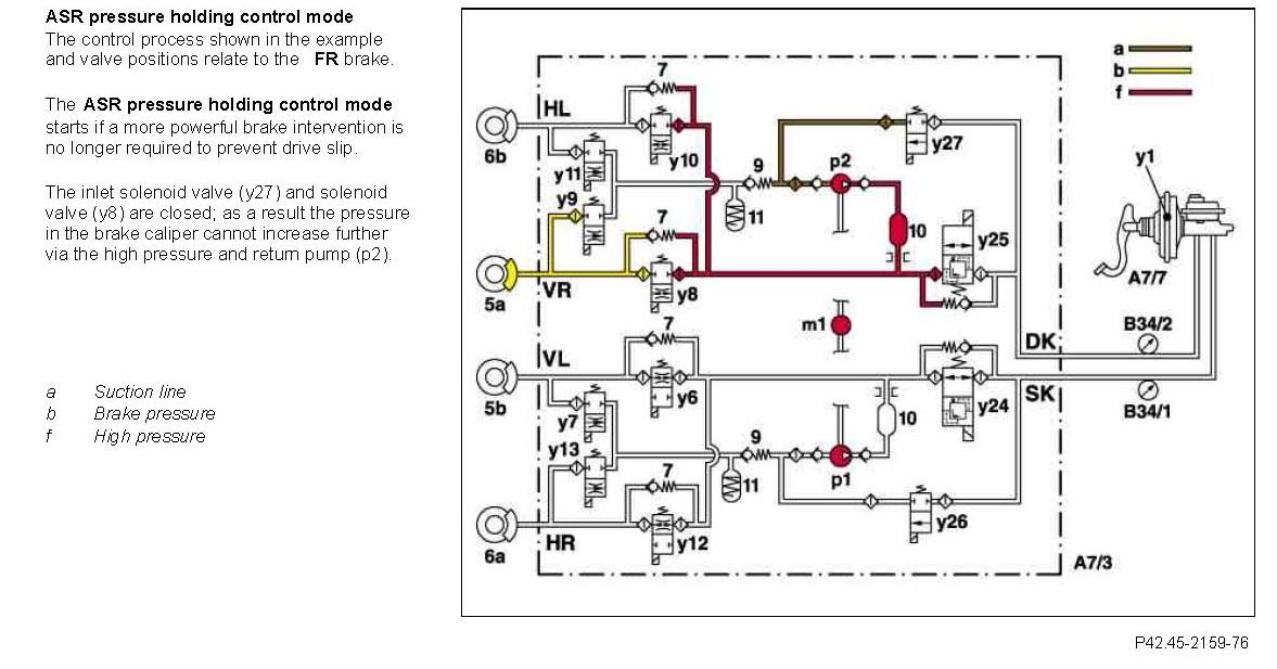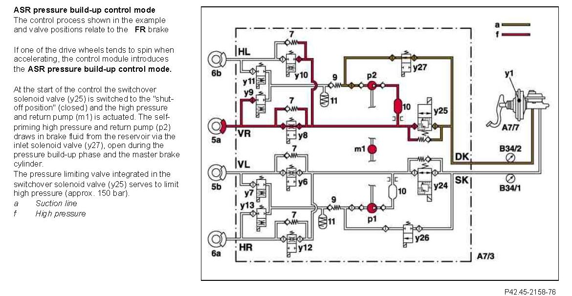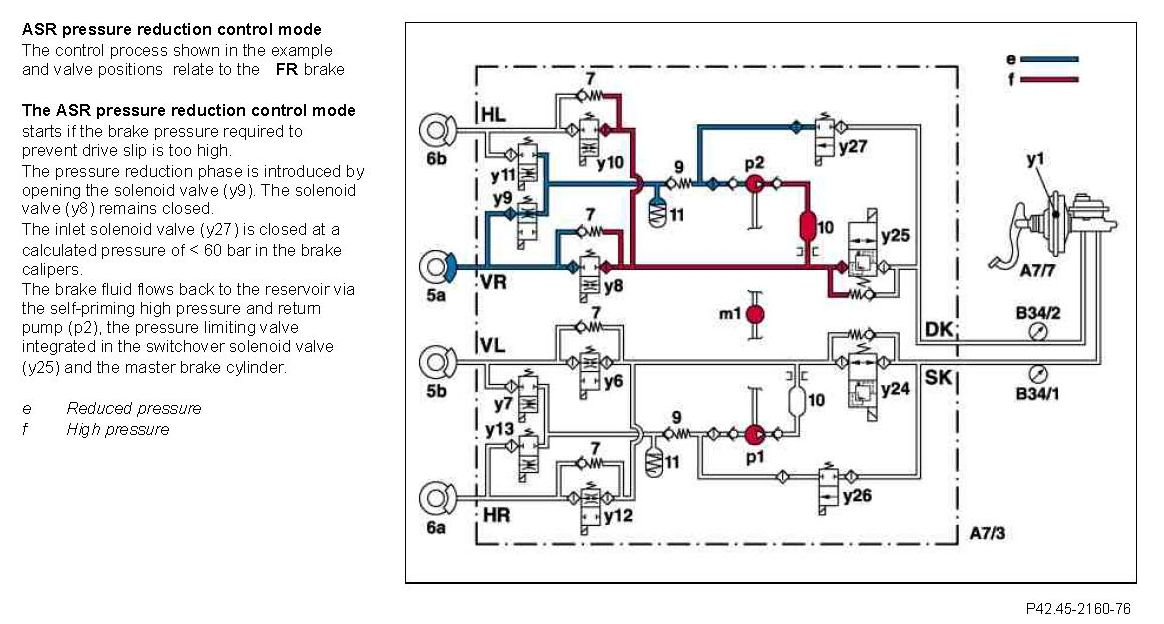 At the end of the pressure reduction phase the system pressure (approx. 150 bar) between the self-priming high pressure and return pump (p2), the switchover solenoid valve (y25) and solenoid valve (y8) is initially led to both the brake calipers of the circuit after the high pressure and return pump (ml) is switched off. This prevents the system pressure in the tandem master brake cylinder being released suddenly and reduces the noise build-up associated with this.