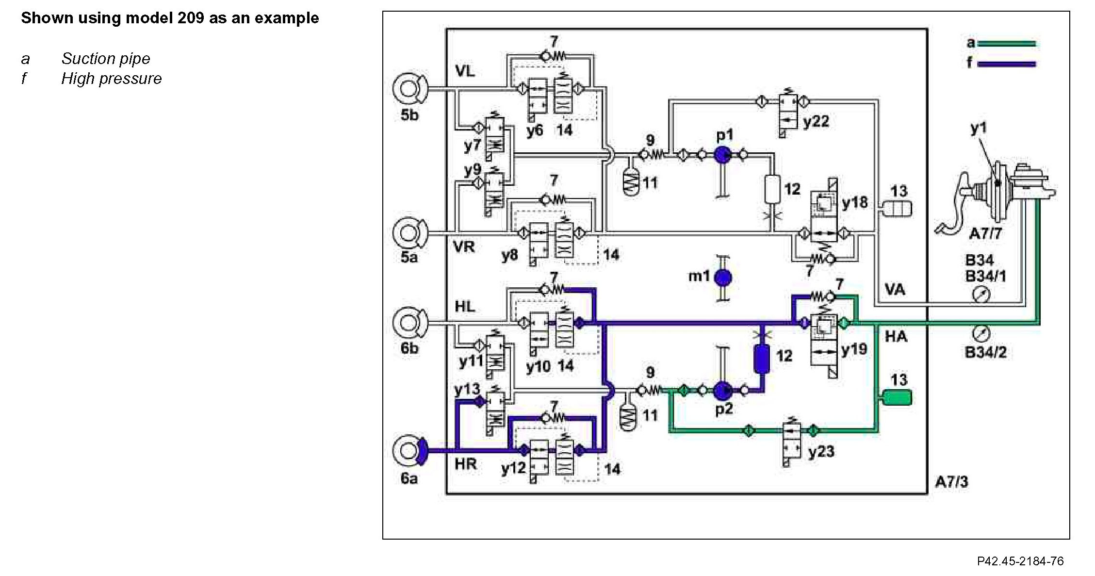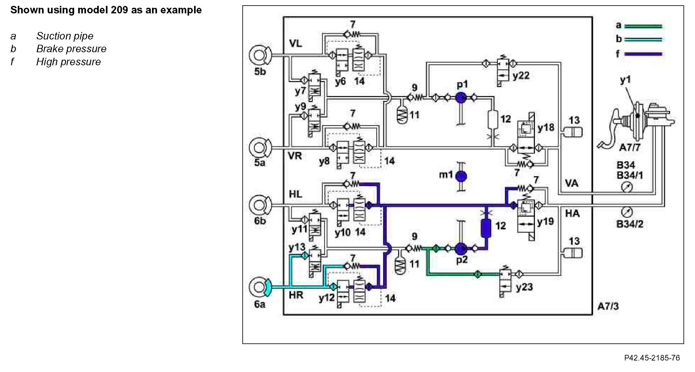 The brake fluid flowing back returns to the brake fluid reservoir via the rear axle pump (p2) through the pressure limiting valve integrated in the rear axle switchover solenoid valve (y19) via the master brake cylinder.
