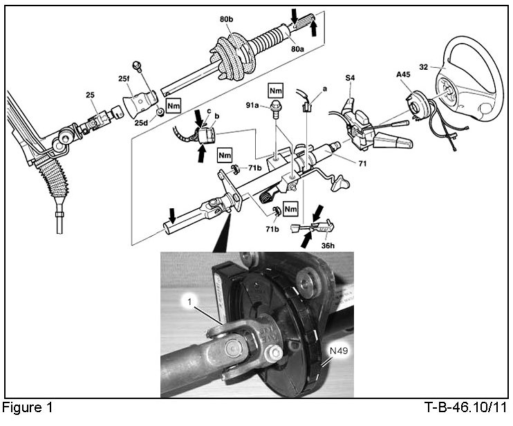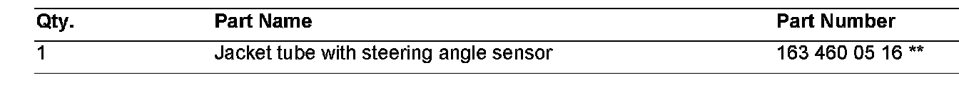 For Model 163 vehicles, please ensure WIS document AR46.10-P-0400GH is followed and adhered to when removing and installing the jacket tube. Do not separate the coupling (Figure 1, 1) below the Steering Angle Sensor (N49) or damage to the sensor rotor may occur. A damaged sensor due to improper jacket tube removal/installation may trigger the following reoccurring fault codes: C1172 (Steering Angle Sensor Internal Fault) or C1174 and C1178 (Steering Angle Sensor Not Initialized). If the Steering Angle Sensor is found defective, do not transfer the Steering Angle Sensor from the new jacket tube to the previously installed jacket tube.