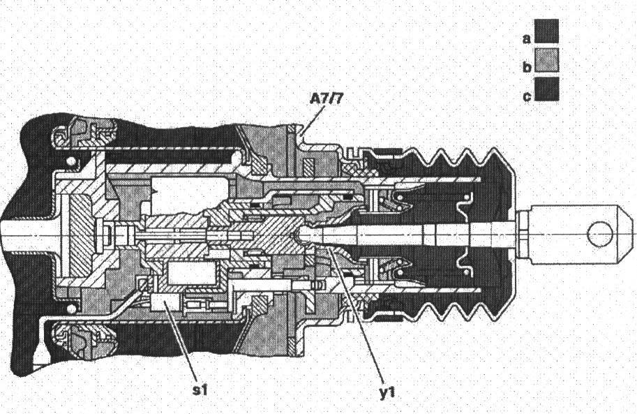 The BAS brake booster (A7/7) is continuously supplied via the vacuum pipe with intake pipe vacuum or pump vacuum on the diesel. When the brake pedal is not operated the same vacuum prevails on both sides of the diaphragms. The compression spring holds the diaphragm plate in its initial position.