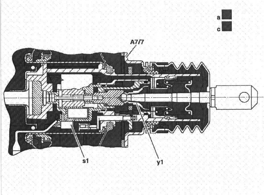The conditions for switching on BAS braking are met, the BAS solenoid valve (y1) is open. Atmospheric pressure acts on the back of the rolling diaphragm. The pressure difference between the back and front side of the diaphragm causes maximum brake boost.