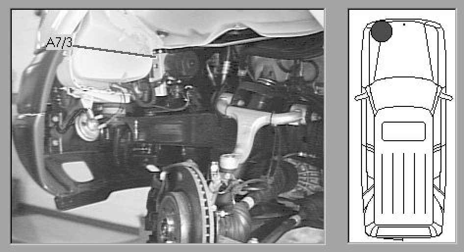 LF wheel well, Engine compartment lower front, just above frame rail.