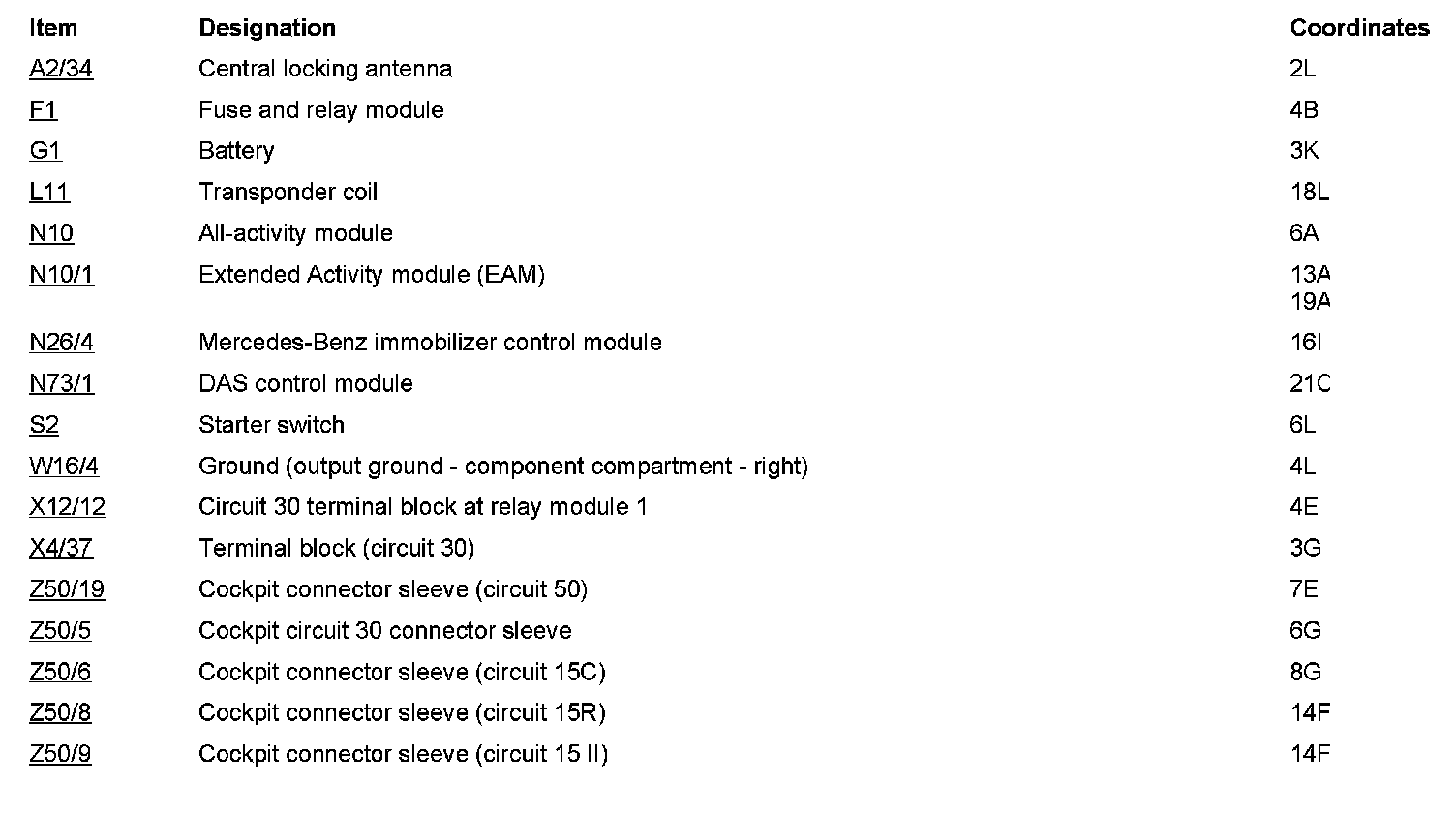 Component Description/Coordinates, A2/34 to Z50/9: