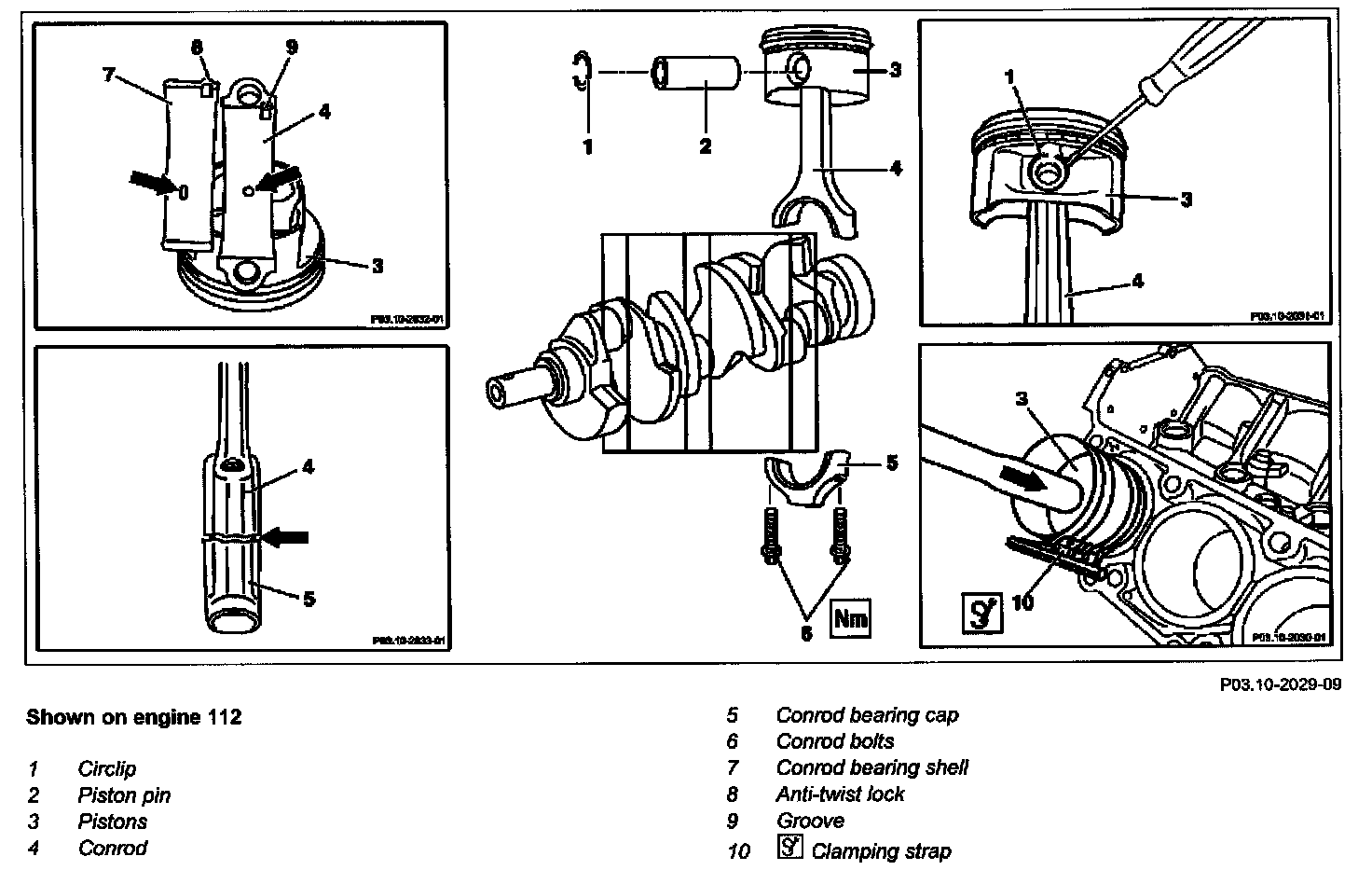 - The anti-twist locks (8) of the connecting rod bearing shells (7) must be located in the grooves (9) of the conrods (4) and the connecting rod bearing cap (5).