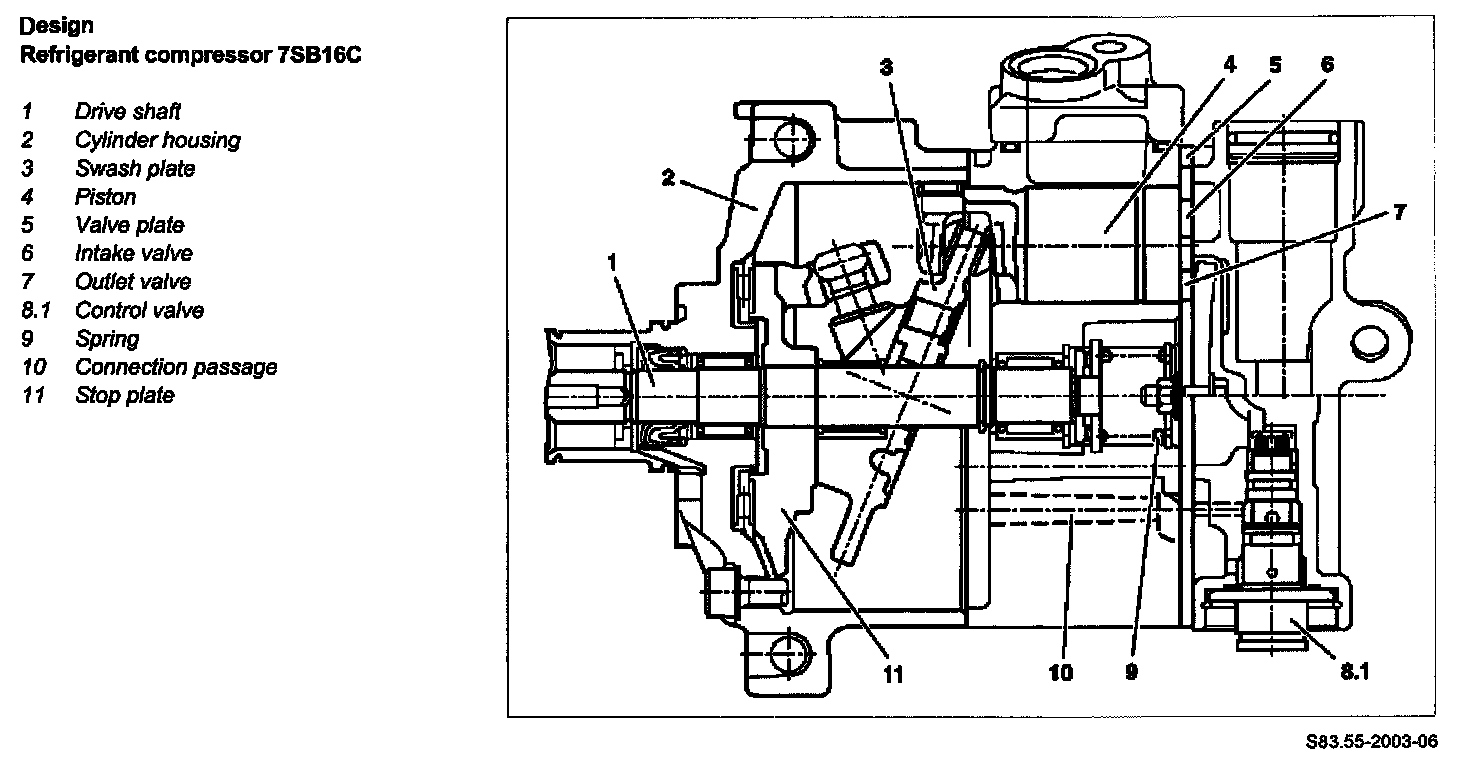 The A/C compressor (A9) is responsible for sucking in and compressing the