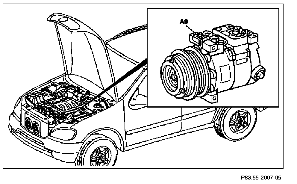 The refrigerant compressor (A9) is flanged to the engine at front left