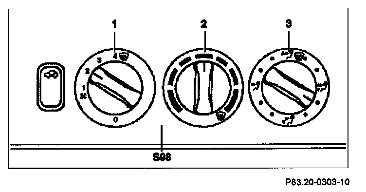 Air distributor switch (3): with positions: defroster nozzle, footwell, middle level and intermediate positions.