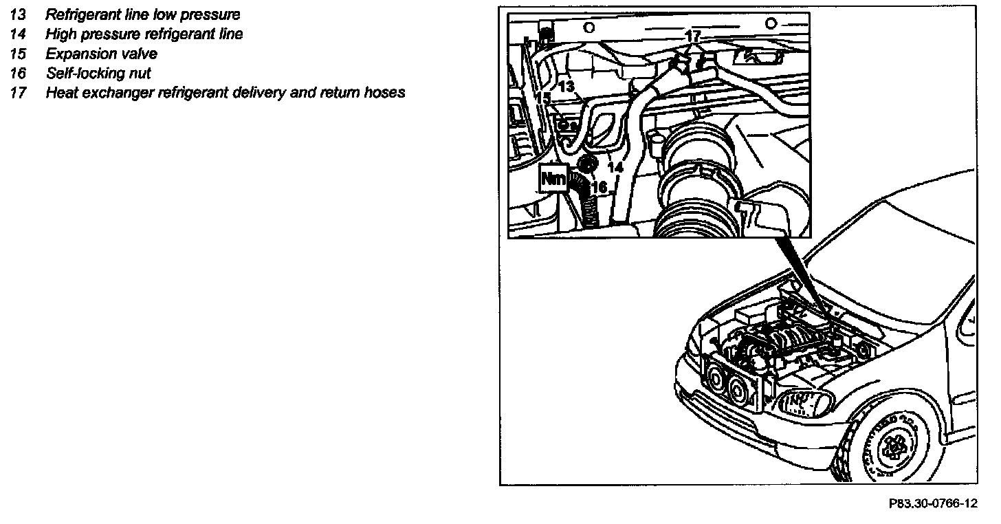 11 Disconnect low pressure refrigerant line (13) and high pressure refrigerant line (14) from expansion valve (15)