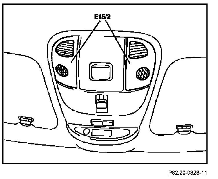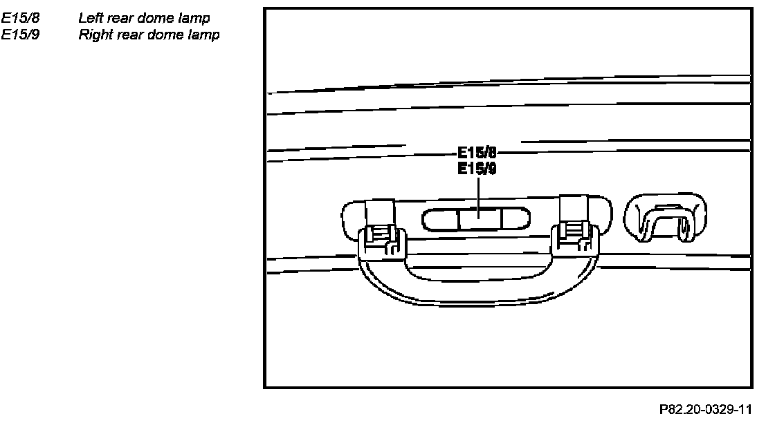 The front dome lamp (with shut-off delay and reading lamp) (E15/2), the right rear dome lamp (E15/9) and the left rear dome lamp (E15/8) can be switched manually to continuous operation. Each lamp is equipped with a switch which is actuated by pressing the lamp glass. The actuated switch interrupts the automatic lamp actuation by the all activity module (AAM, N10) and simultaneously switches the lamp connected to c. 30 to ground. Continuous operation can only be terminated by pressing the switch again. It is not possible to switch off the automatic lamp actuation.