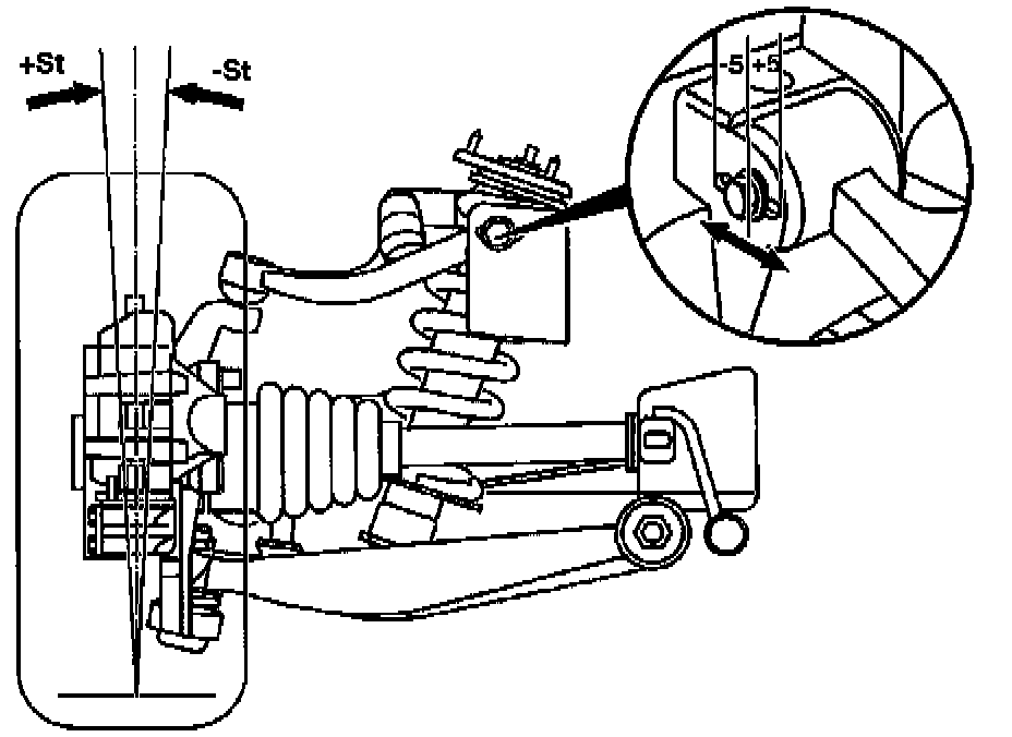 6. Adjust camber or caster. The rear axle camber is corrected via the front bolted connection of the top wishbone/vehicle frame. The caster is adjusted at the rear bolted connection of the top wishbone/vehicle frame.
