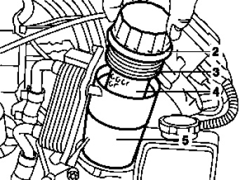 1 Use a socket wrench bit to unscrew the screw cap (2) and remove it along with the oil filter element (4).