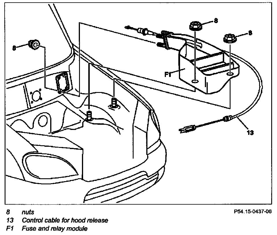 14 Unhook control cable for hood release (13) from the operating lever and route cable outwards through the fuse and relay module
