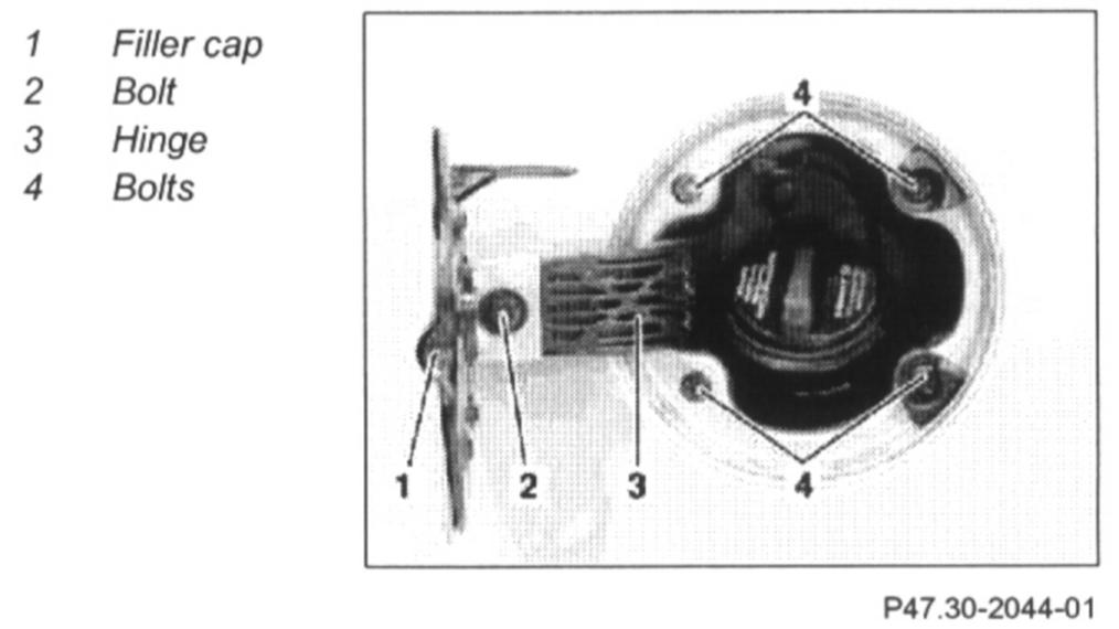 NOTE: Installation: Install bolt (2) with locking agent. Adjust the filler cap correctly