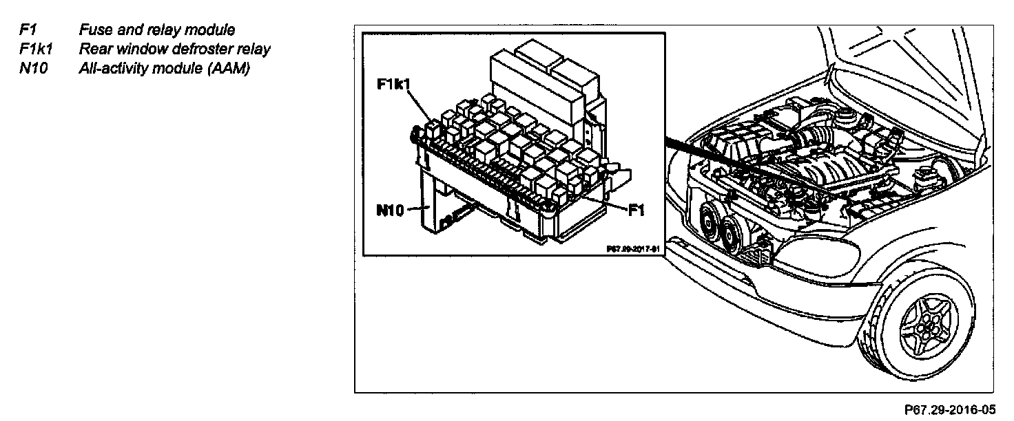 The relay (F1k1) is the operating relay forth rear window defroster. It is actuated by the extended activity module (EAM) (N10/1).
