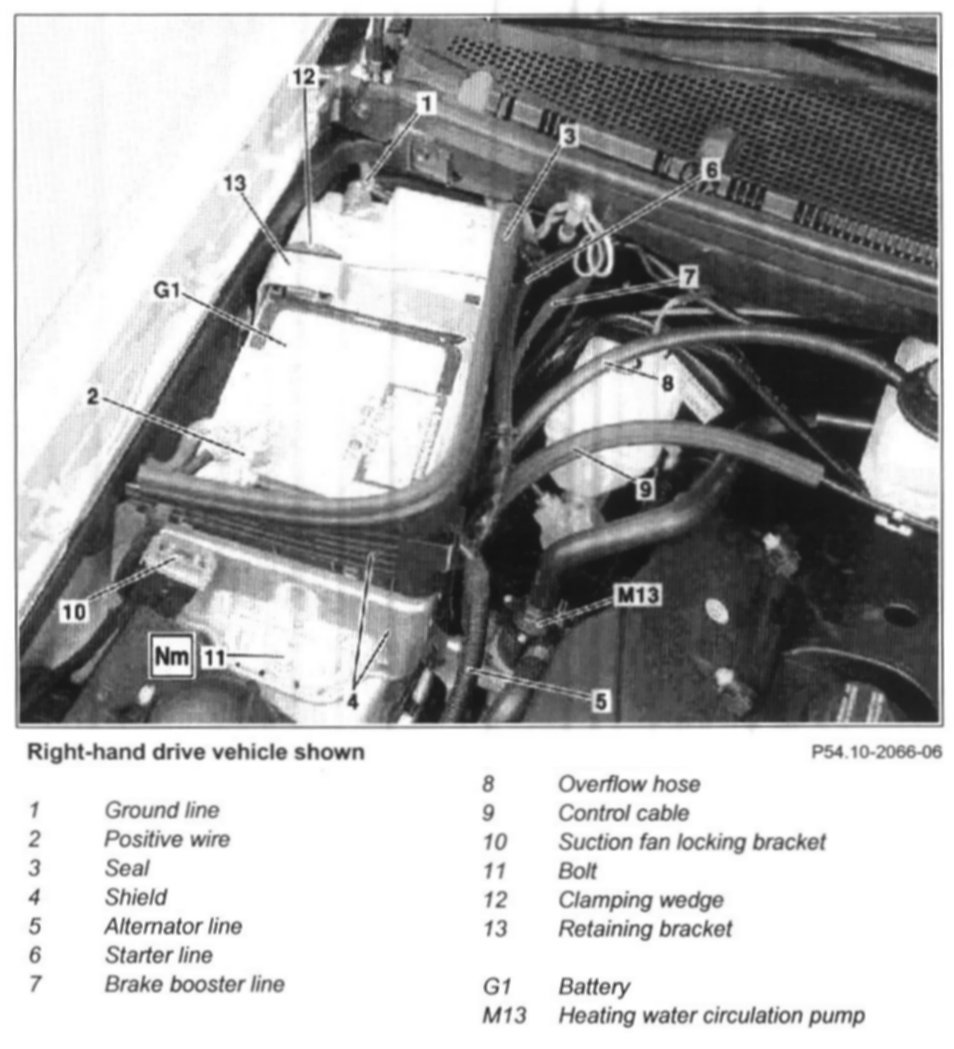 3 Remove protective shield at positive pole of battery and remove all lines attached to positive cable (2)