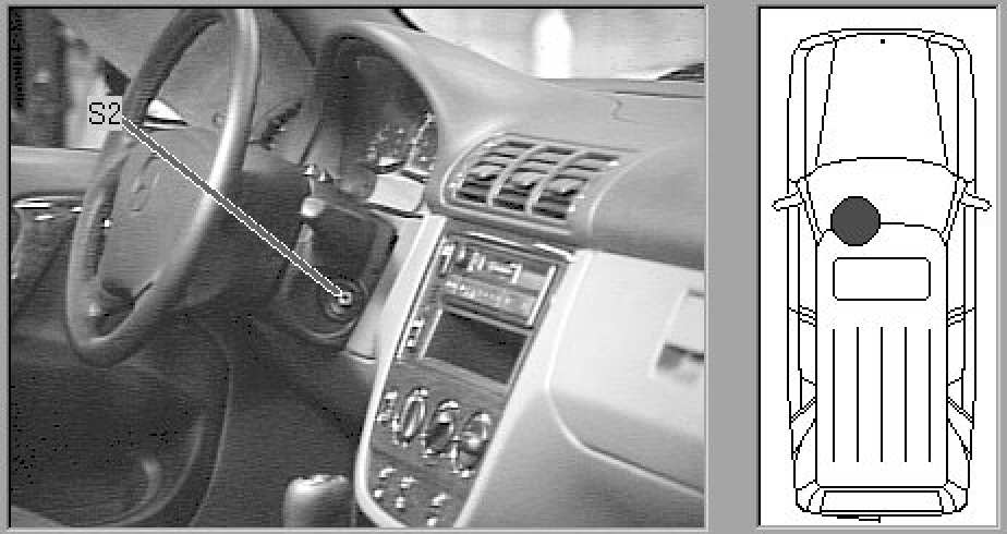 Passenger compartment, to right of steering wheel.