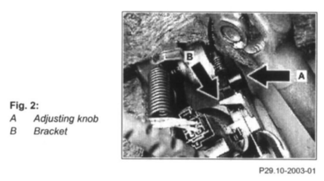 6 Press and hold down adjusting knob (Figure 2, A) at bottom end of shift lock cable. At the same time push the cable towards the adjuster.