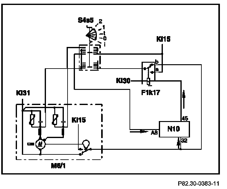 Power is supplied to the motor by the cam switch and non-actuated contact of the relay F1k17 (pin b) until the wiper arm has reached its park position. When the park position is reached the cam switch switches over.Then the two motor connectors are short-circuited and the motor is braked by the eddy-currents.