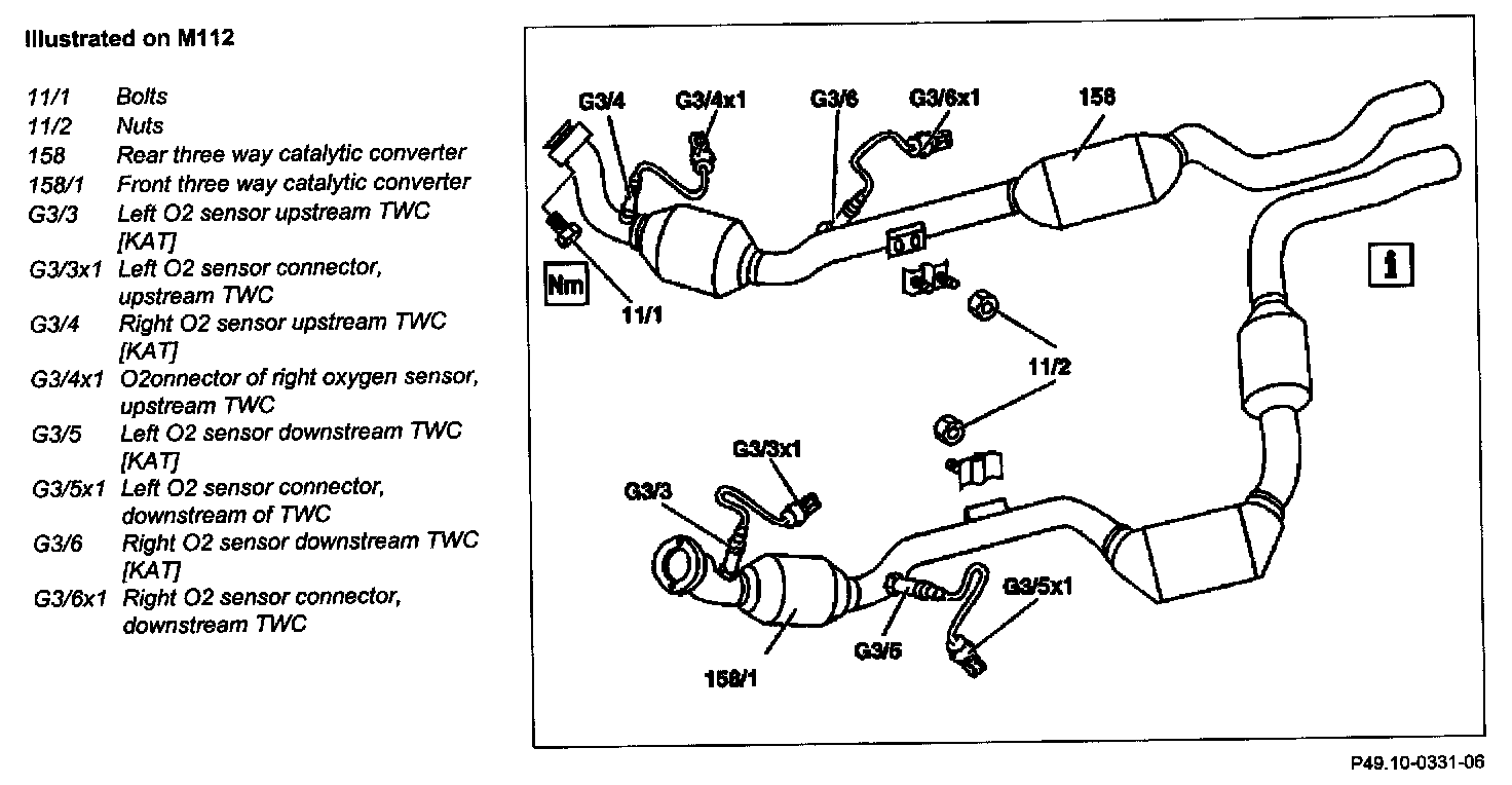 NOTE: Ensure, that when removing and installing rear three way catalytic converter (158) and front three way catalytic converter (158/1), the shields at the vehicle underbody are not damaged.