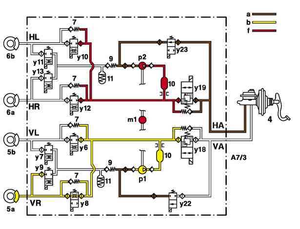 --> Actuated and switches to the flow position, the pressure reduction in the right front wheel brake (5a) is therefore initiated when the right front solenoid valve, hold pressure (A7/3y8) is closed.