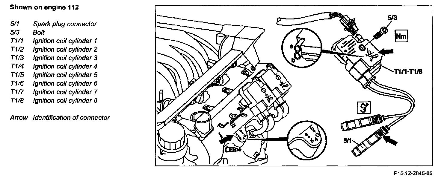 - Installation: Observe identification of connector (arrow) on the cylinder head cover and the ignition coil cylinder (T1/1 up to T1/8) or (T1/1 up to T1/6) for corresponding spark plug connector (5/1)