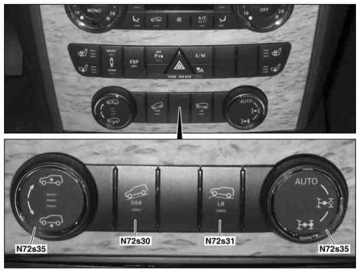 By turning the level control selector wheel to the right the driver can raise the vehicle level up to the Off road level 3 and lower down to the Highway level by turning to the left. The associated LED in the level control function indicator flashes until the level is reached in each case. When the level is reached the LED remains constantly on.