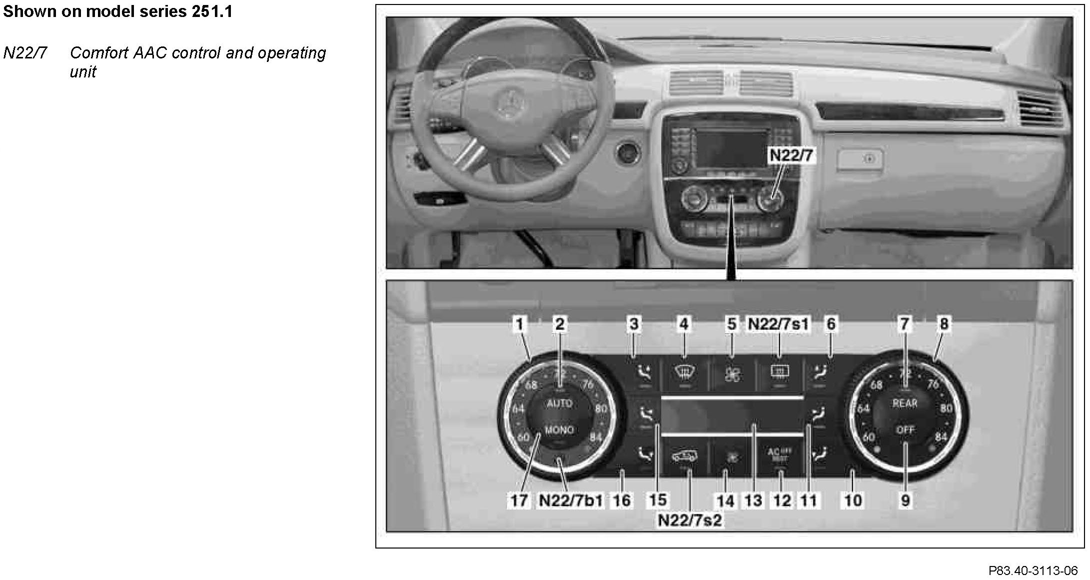 When the REAR button on the comfort AAC control and operating unit (N22/7) is pressed, the operating unit symbol appears in the front display. The blower setting is not visible. The rear temperatures can be set on the keyboard.The function is stopped automatically, if operation is not performed within approx. t = 5 s or the REAR button is pressed again.When the AUTO button or the REAR Button is pressed, the REAR operation can be stopped.