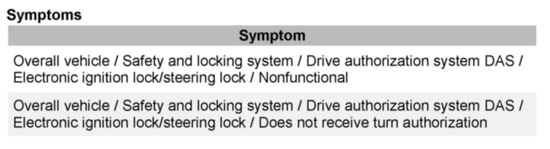 Prior to performing the DAS test, you should see event code "65535" in the EZS ECU log. After performing the DAS test, this code will change to another value such as 4, 6, 17, 25 etc. instead of 65535. This new value will be displayed on the test result page and indicates which component is faulty (EZS, ESL; key) or if the system is okay. As per the second bullet point above, please provide both the initial EZS control unit log, and a second log that shows the processed fault event (e.g. 4, 6, 17, etc.)